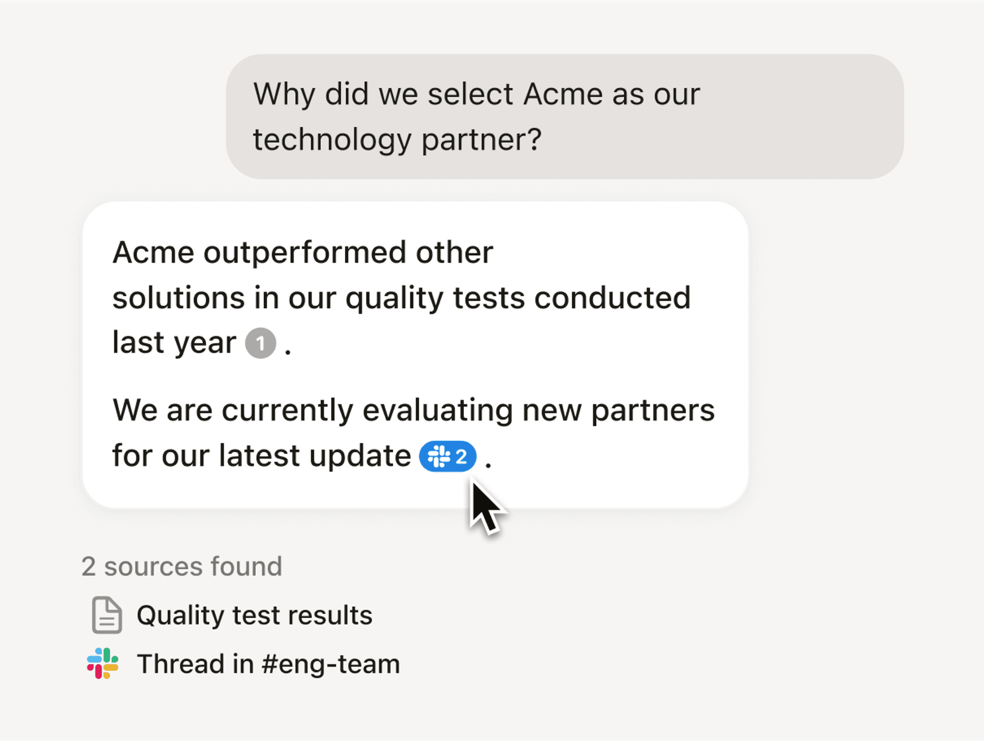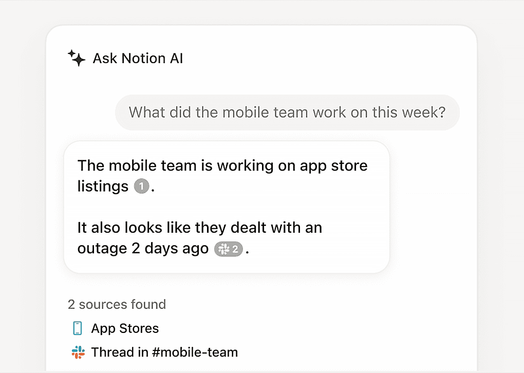 Actuellement, l’IA de Notion vous permet de poser n’importe quelle question sur le contenu de votre espace de travail Notion. En connectant Slack ou Google Drive à l’IA de Notion, lorsque vous posez une question, l’IA affichera également des réponses pertinentes en provenance de ces différentes sources, en citant les messages spécifiques auxquels elle fait référence.